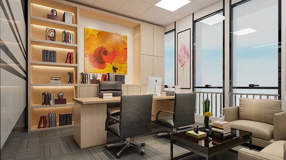 設(shè)計師采用黑與白的對比,提高總經(jīng)理室裝修設(shè)計功能空間的通透性和變化性來烘托出空間的莊重嚴肅。此外還加入原木色桌柜,綠色植物甚至青藍色這樣的亮色來點綴,增加空間的美觀度。